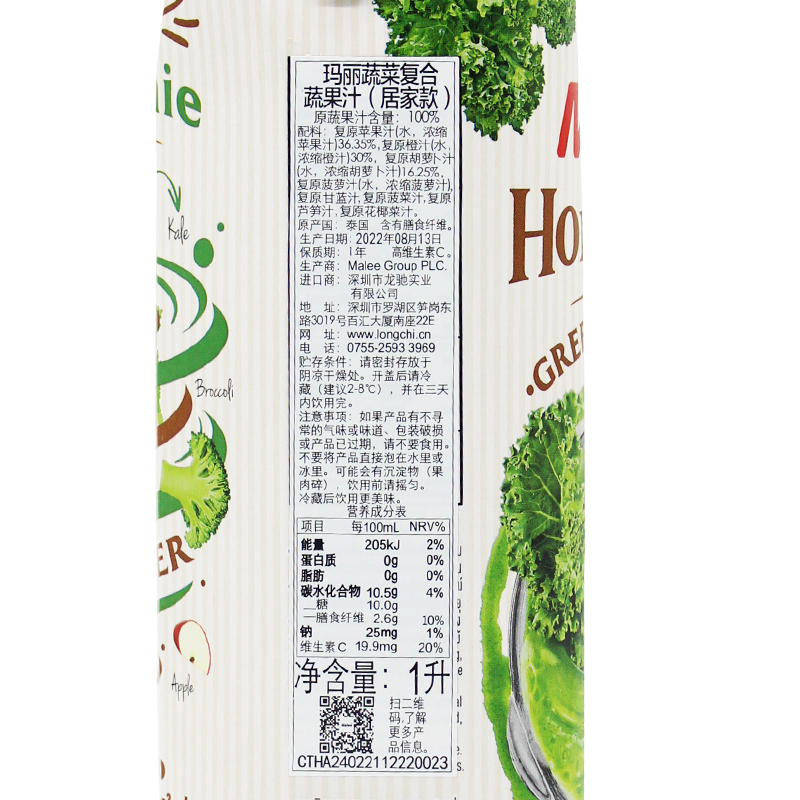 Ingredients: Apple juice from apple juice concentrate 36.35%, Orange juice from orange juice concentrate with orange pulp 30 .00%, Carrot juice from carrot juice concentrate 16.25%, Pineapple juice from pineapple juice concentrate 15.00%, Kale Juice 1.00%, Spinach Juice 0.50%, Asparagus Juice 0.50%, Broccoli Puree 0.40%.