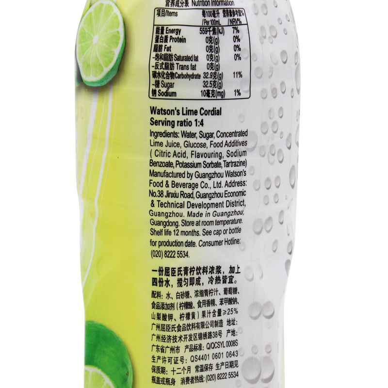 配料:水,白砂糖,浓缩青柠汁,葡萄糖,食品添加剂(柠檬酸,食用香精,苯甲酸钠,山梨酸钾,柠檬黄)